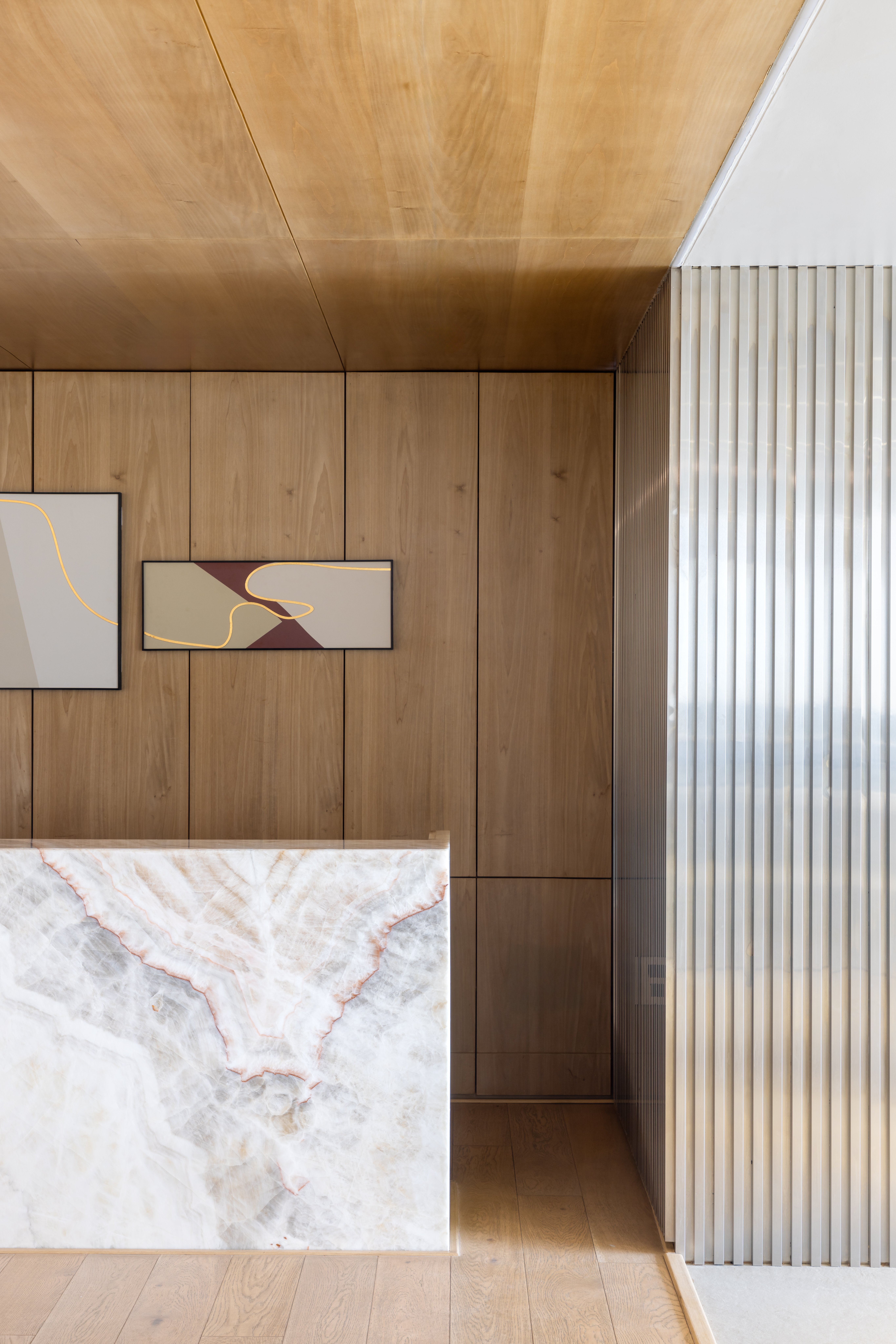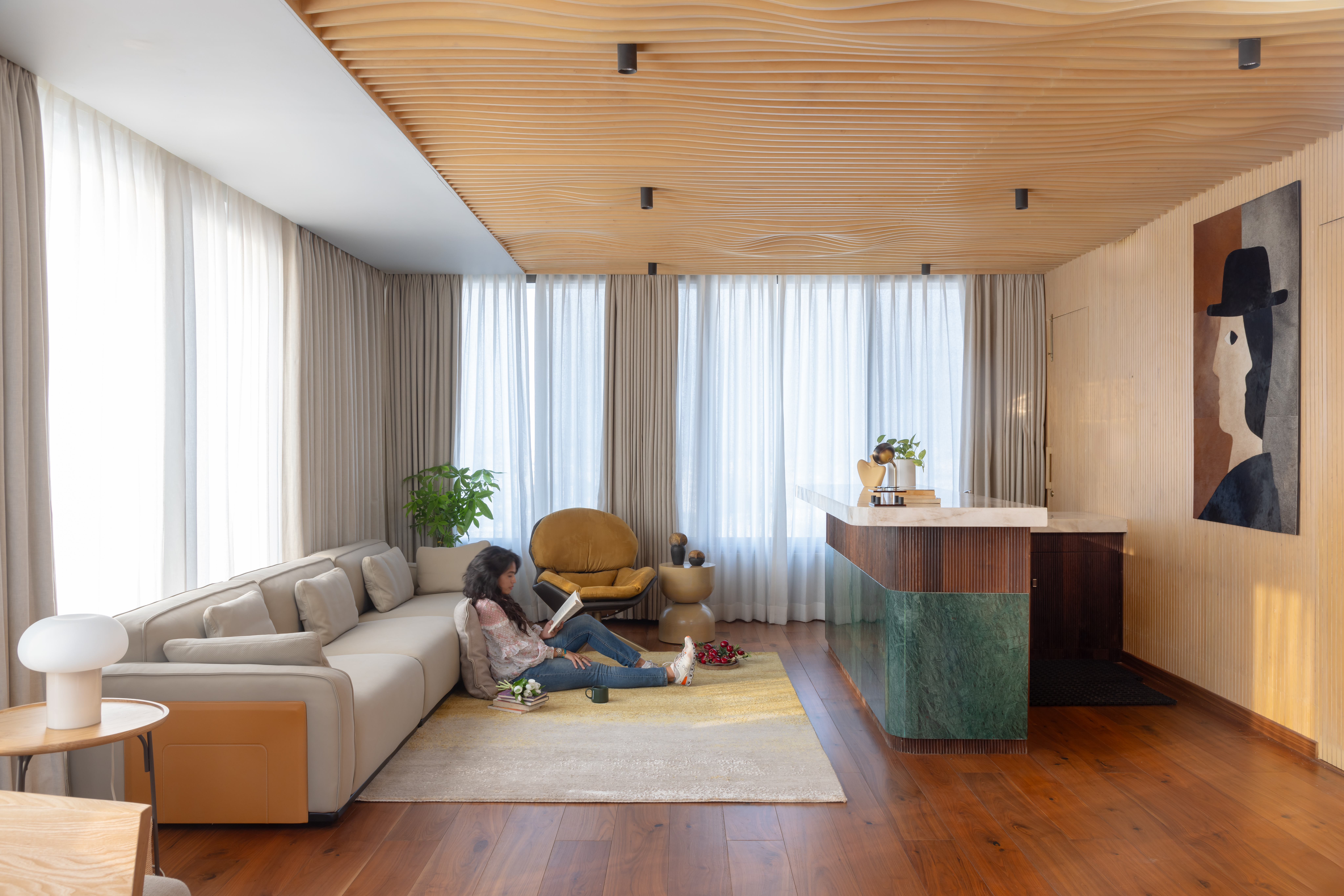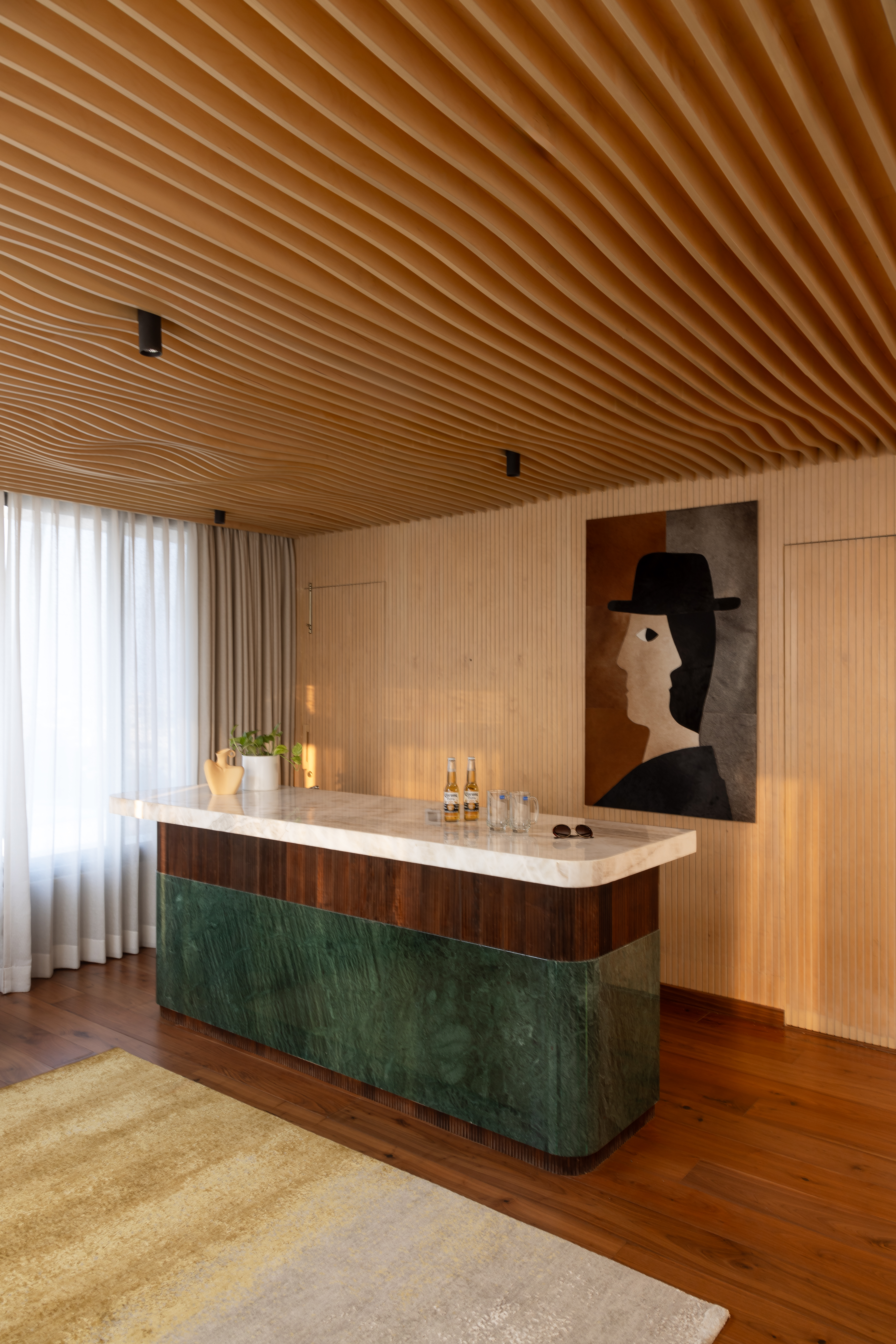 A neutral palette forms the base of the interiors, complemented by natural wood finishes that bring warmth and character to the space. Clean lines and uncluttered surfaces define the overall aesthetic, while carefully selected materials add depth and texture without overwhelming the design.