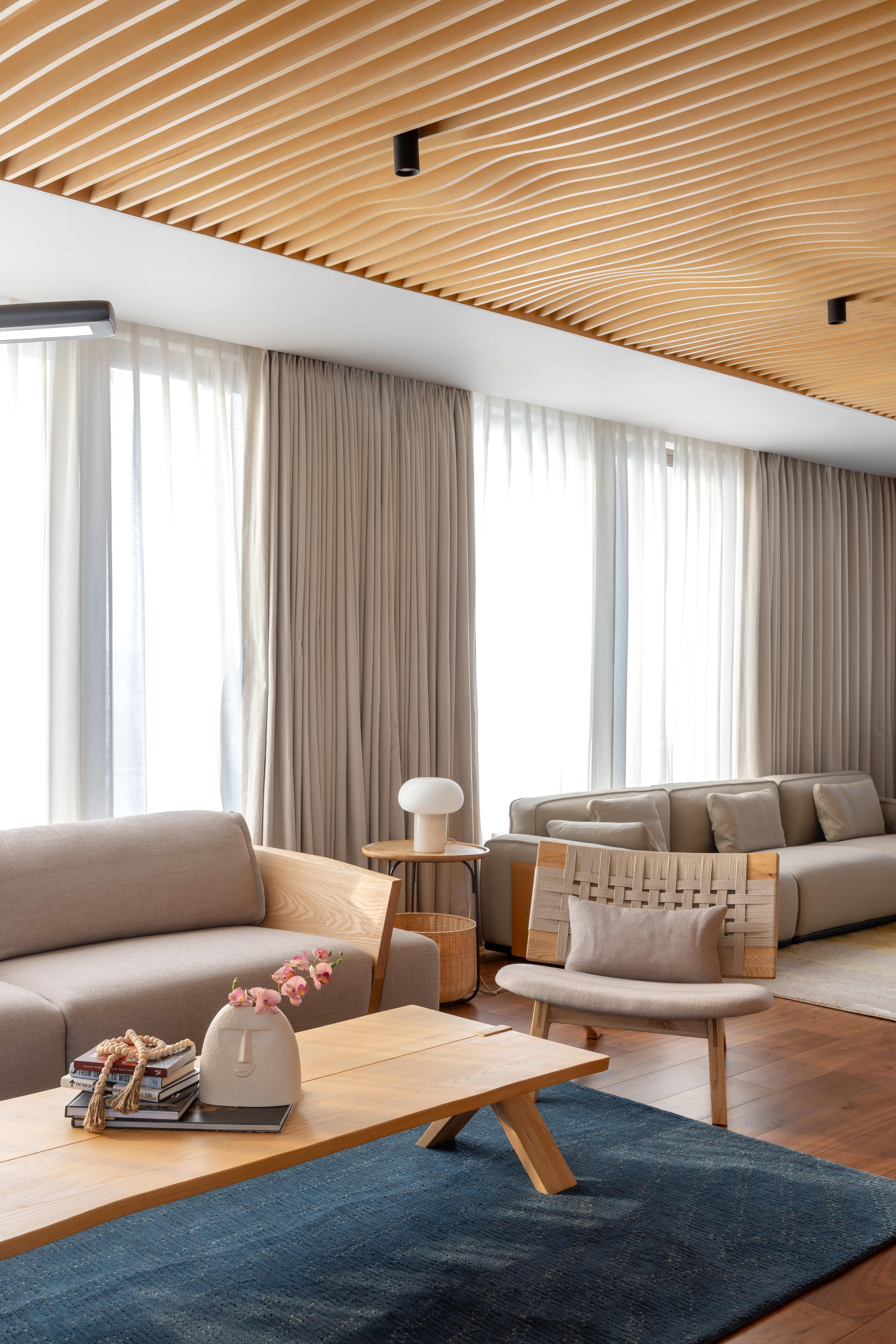 A neutral palette forms the base of the interiors, complemented by natural wood finishes that bring warmth and character to the space. Clean lines and uncluttered surfaces define the overall aesthetic, while carefully selected materials add depth and texture without overwhelming the design.