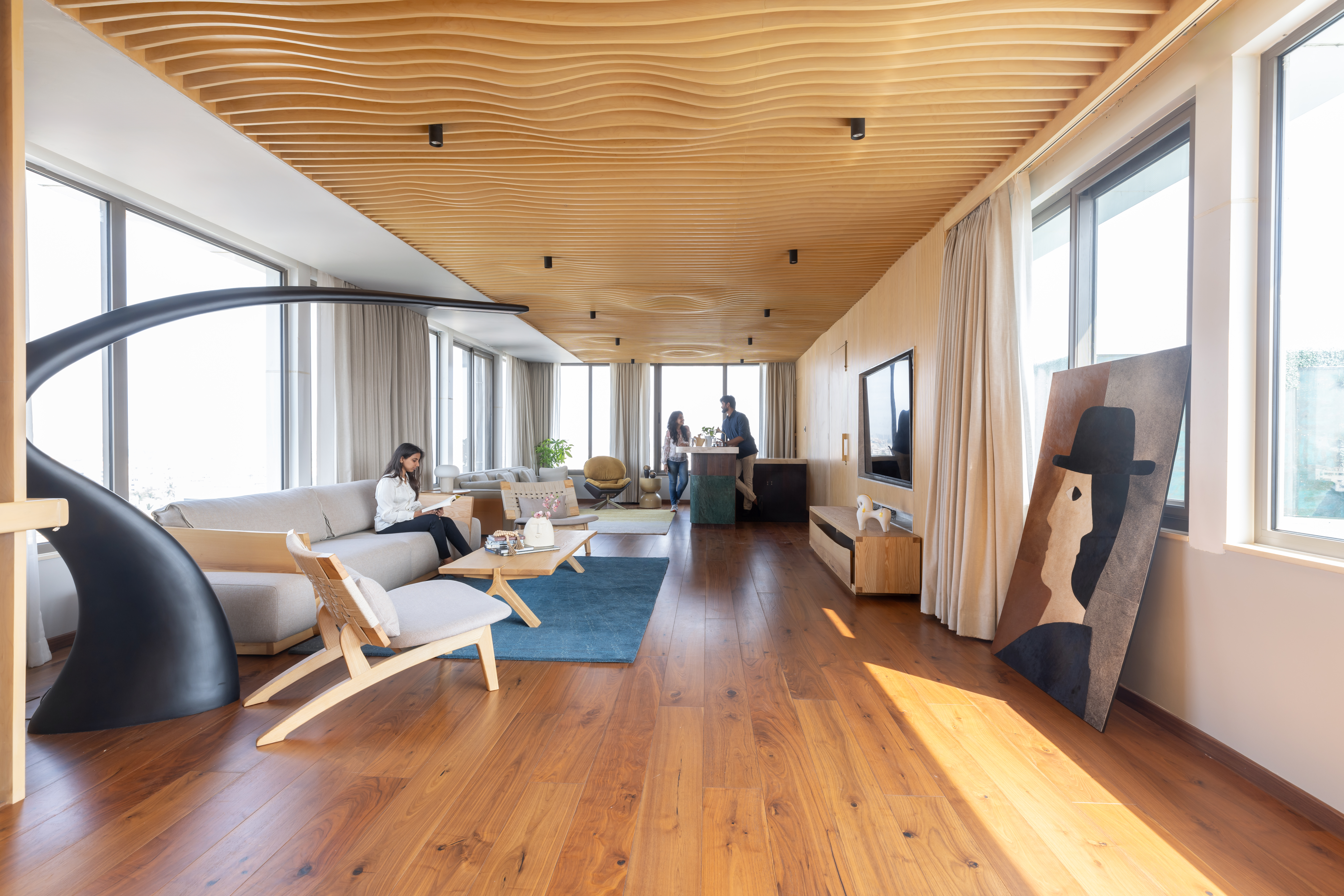 Open planning allows for fluid movement and visual connectivity across different zones, encouraging collaboration while maintaining a sense of individual comfort. Soft furnishings, subtle décor elements, and integrated greenery contribute to a relaxed and welcoming atmosphere.